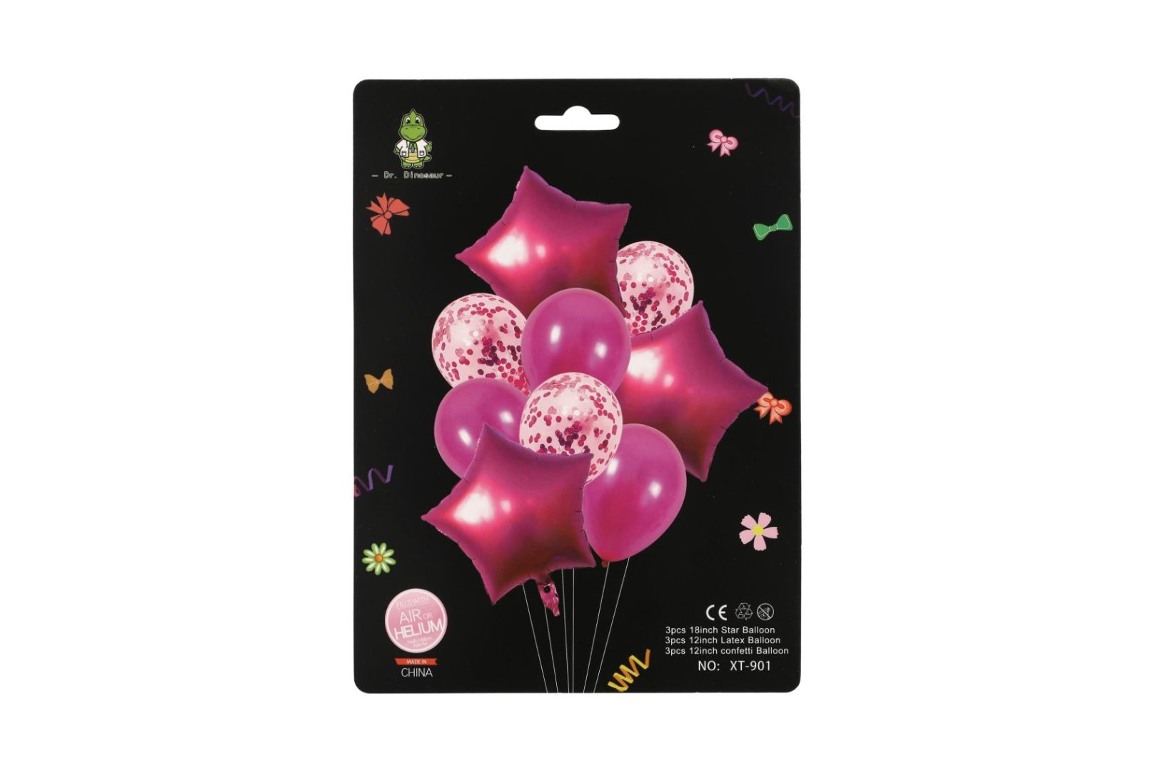 Sada obsahuje celkem 9 kusů: 3× fóliové balonky ve tvaru hvězdy (metalický efekt), 3× latexové balonky s konfetami, 3× klasické kulaté latexové balonky v jemné pastelové růžové barvě