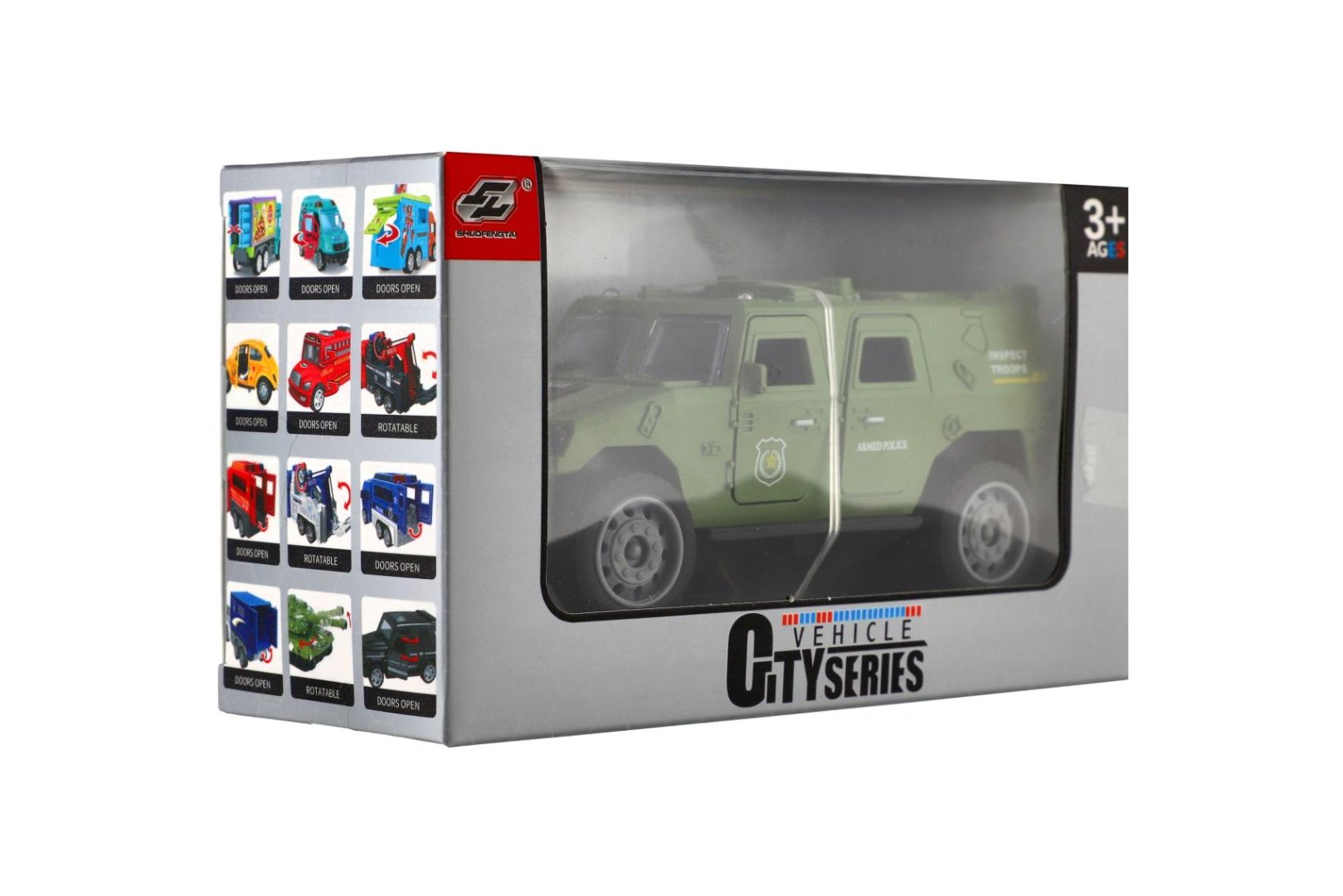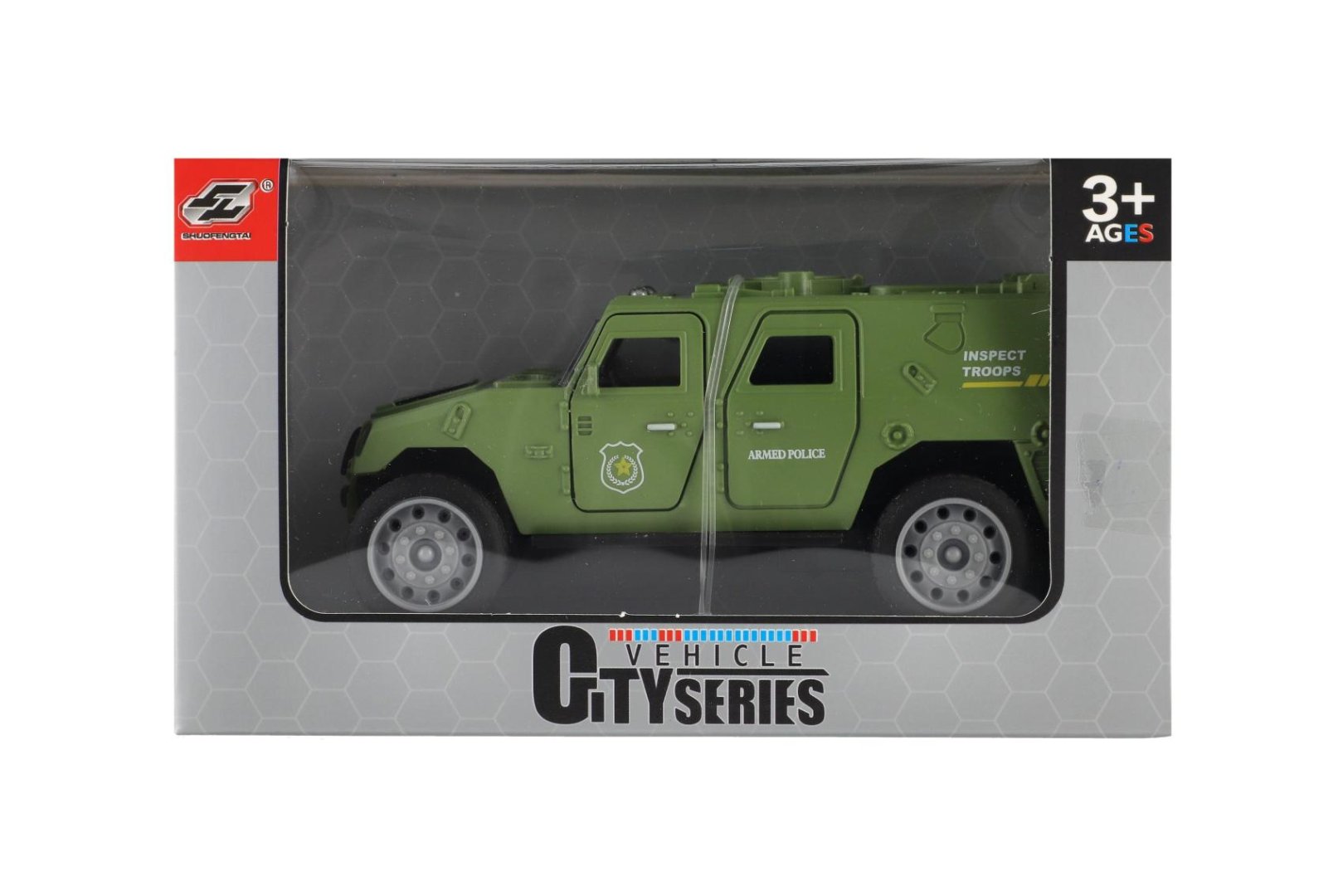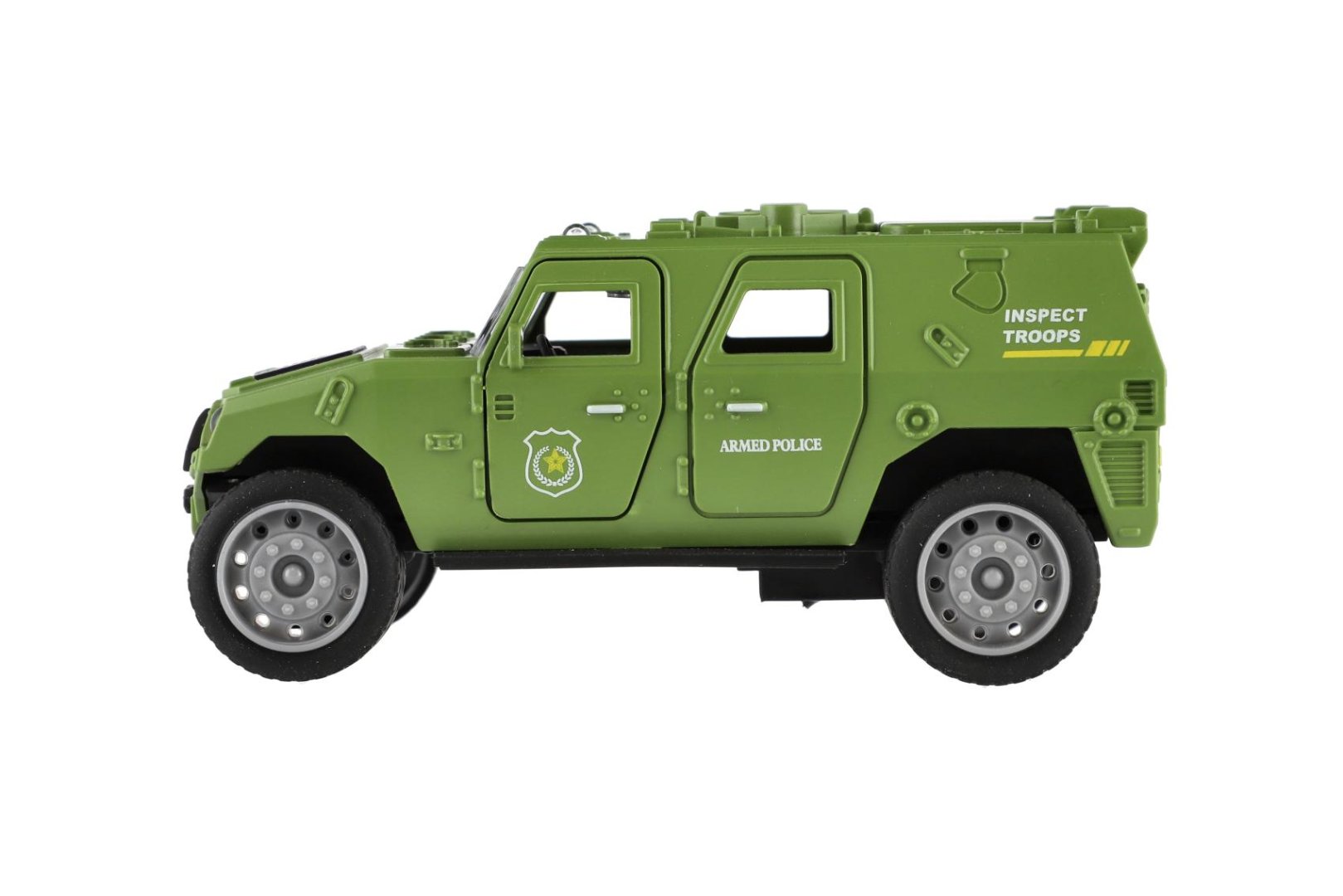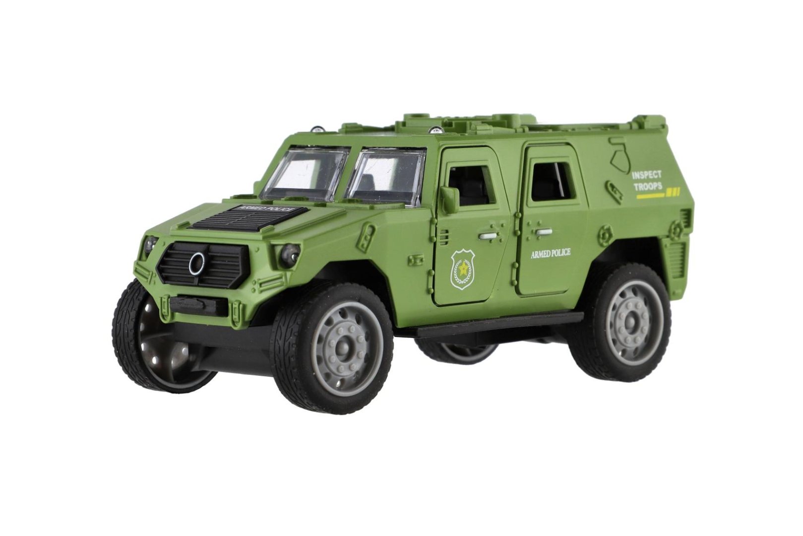 Vojenské auto o délce 13 cm je vyrobeno z odolného plastu a vybaveno mechanickým pohonem na setrvačník, který zajišťuje plynulý pohyb vpřed po natažení. Model v realistickém designu potěší všechny malé milovníky armádních vozidel a akčních scén.