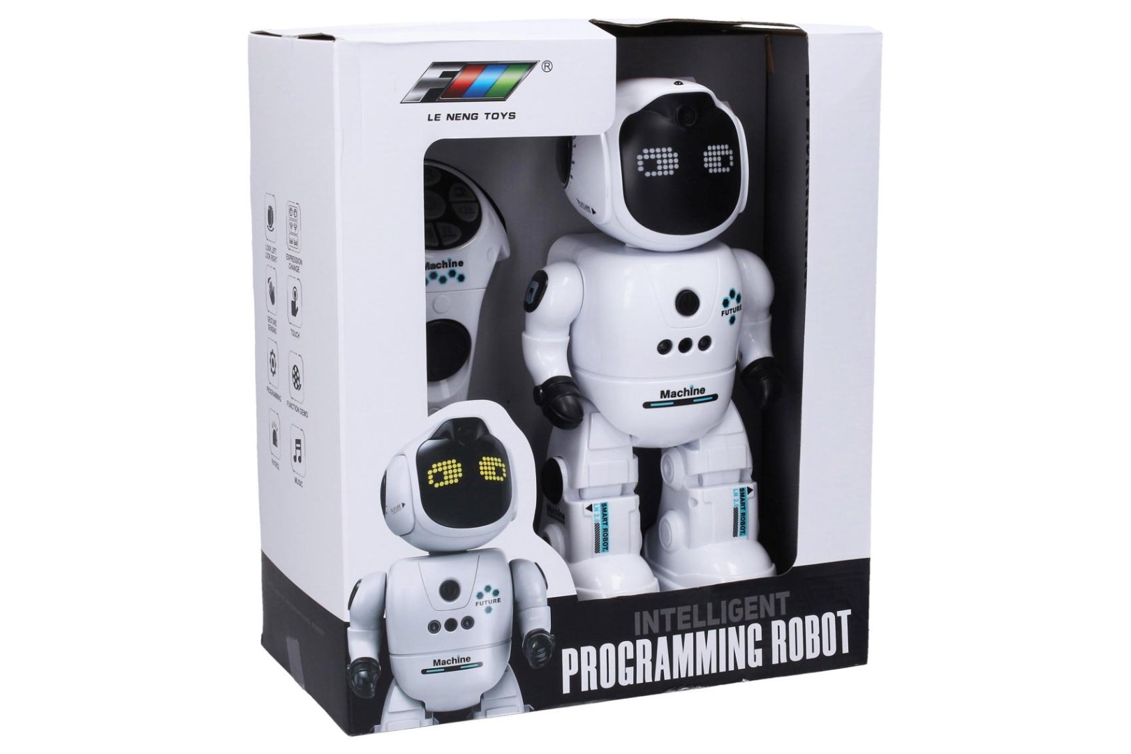 Funkce - podsvícený obličej (mění výraz), pohyb hlavy, ovládání pohybem ruky, ovládání dotykem, programování, demo režim, zvuky, hudba, nastavení hlasitosti
