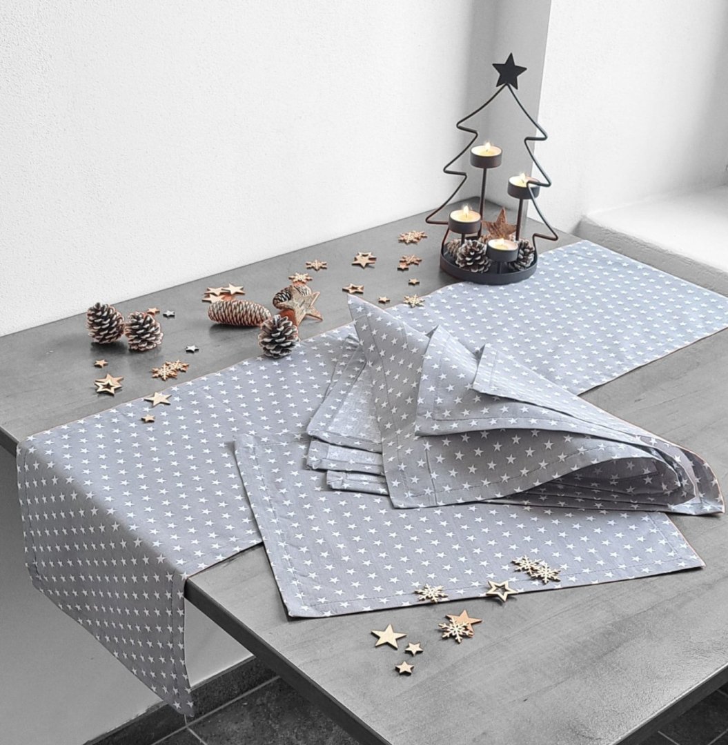 Vytvořte si dokonalou sváteční atmosféru! Tato vánoční sada s běhounem na stůl a prostíráním je ideálním doplňkem pro vaše vánoční stolování.Vytvořte si dokonalou sváteční atmosféru! Tato vánoční sada s běhounem na stůl a prostíráním je ideálním doplňkem pro vaše vánoční stolování. Běhoun i prostírání s okouzlujícím zimním a vánočním motivem okamžitě vnesou do interiéru útulnou a slavnostní atmosféru. Jsou vyrobeny z vysoce kvalitní 100% bavlny, která je příjemná na dotek a nenáročná na údržbu. Jemný šedý podklad s roztomilým vzorem bílých hvězdiček se hodí nejen na Vánoce a advent, ale i pro celou zimní sezónu.