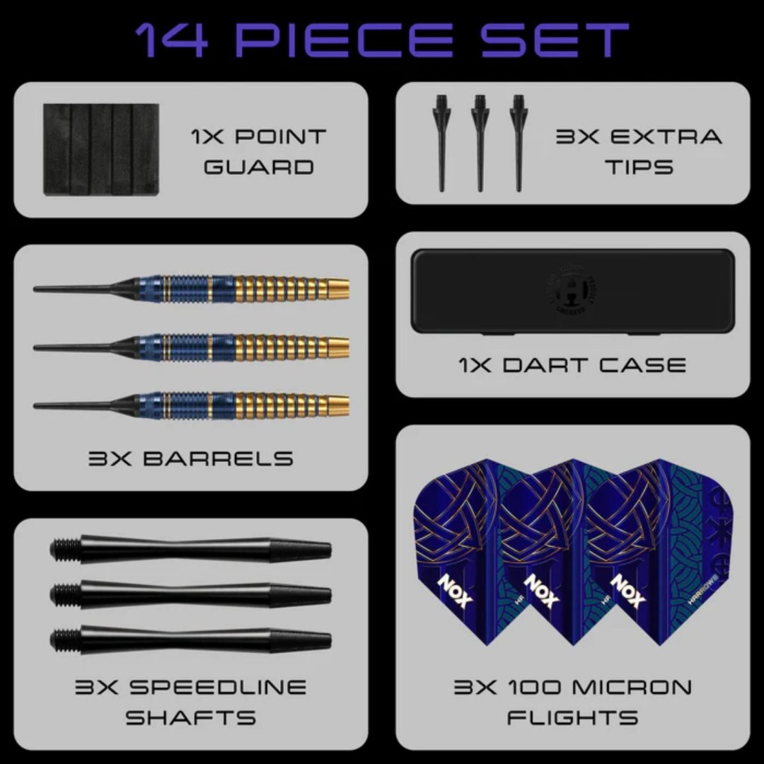Softové šipky Nox jsou mosazné šipky v dokonalém designu. Modrá a zlatá barva dodává šipkám luxusní nádech. Barrely jsou doplněny násadkami Speedline a letkami Nox. Balení navíc obsahuje plastové pouzdro a 1 sadu náhradních hrotů.