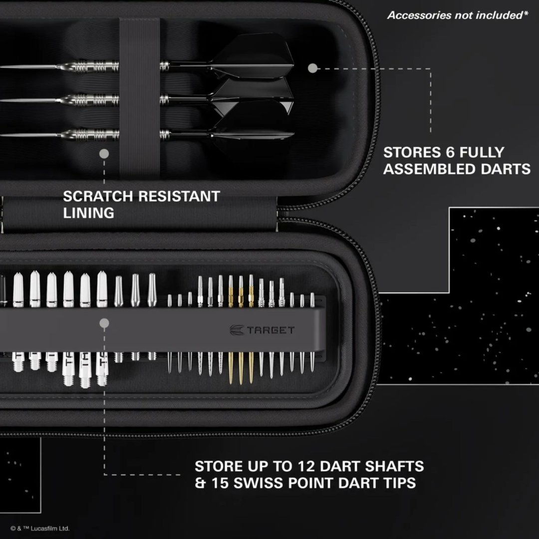 Pouzdro na šipky Target Boa Star Wars je praktické stylové pouzdro, které pojme 2 sady sestavených šipek. Ohromující design potěší všechny fanoušky Star Wars. Pouzdro má také přihrádku pro 4 sady násadek a 5 sad hrotů Swiss Point a místo je tu samozřejmě i pro letky. Pouzdro je pevné, takže vaše šipky budou zcela v bezpečí. Vylepšený design a promyšlené uspořádání dělá pouzdro dokonalým doplňkem každého šipkaře.