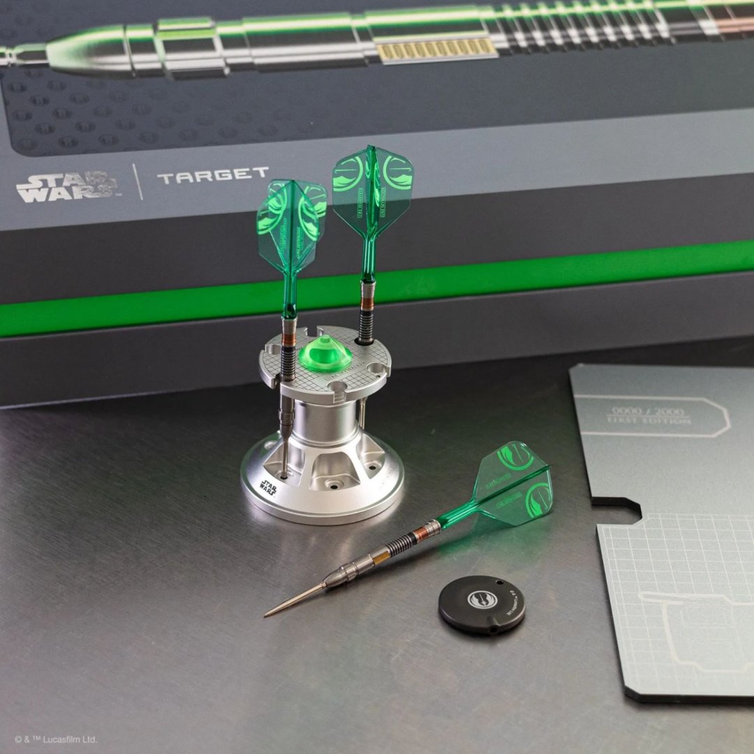 Steelové šipky Target Star Wars jsou exkluzivní wolframové šipky (95 % tungsten) v ohromujícím designu z limitované edice Star Wars. Barrely mají precizní CNC zpracování a ikonický design inspirovaný zeleným světelným mečem. Barrely jsou doplněny K-Flex Star Wars a hroty Swiss Point. Součástí balení jsou navíc i hroty Swiss Point, nástroj na výměnu hrotů Swiss Point a exkluzivní stojánek pro vystavení vašich šipek.