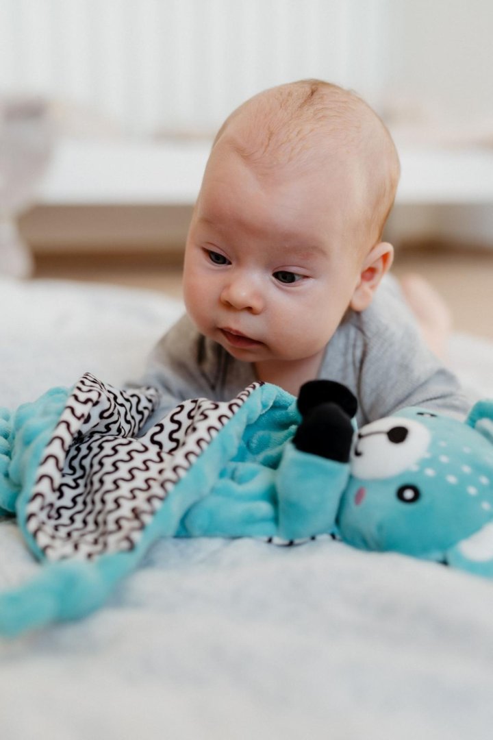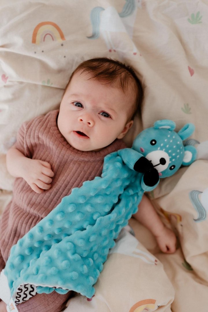 Heboučký plyšový usínáček s hlavou roztomilého medvídka je ideálním parťákem pro miminka již od narození.Heboučký plyšový usínáček s hlavou roztomilého medvídka je ideálním parťákem pro miminka již od narození. Vyrobený z měkkého minky materiálu s 3D puntíky přináší pocit bezpečí, komfortu a pomáhá uklidňovat při usínání. Uvnitř medvídka je ukryté jemné chrastítko, které podporuje sluchový rozvoj dítěte a přirozeně upoutává pozornost. Na jednom z rohů je umístěné měkké silikonové kousátko, které uleví citlivým dásním při prořezávání zoubků. Uzlíky na rozích jsou snadno uchopitelné i pro malé ručičky a podporují hmatovou stimulaci.