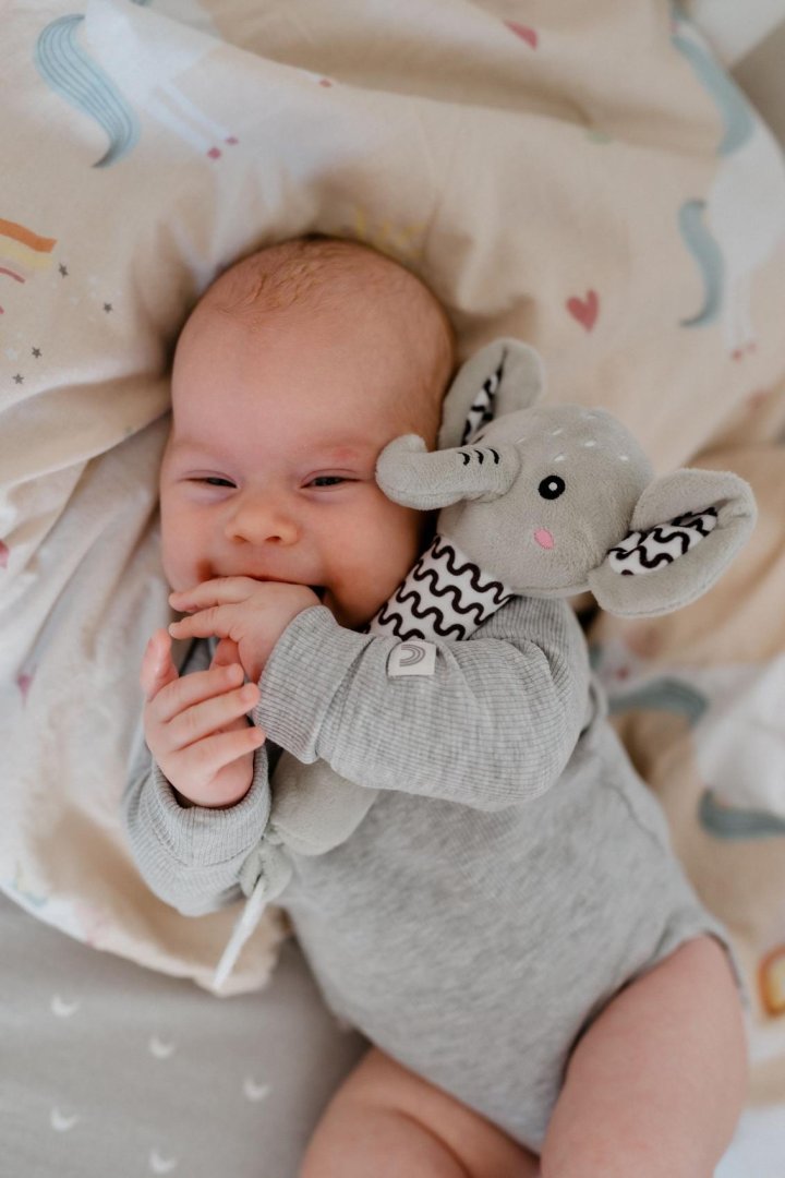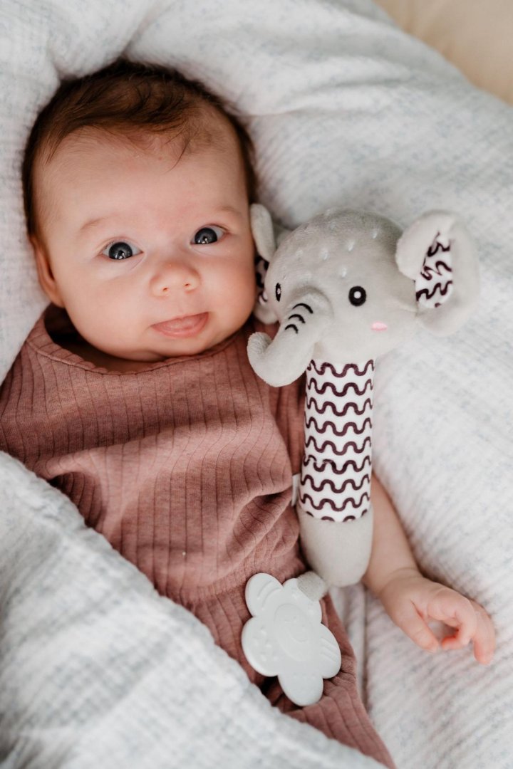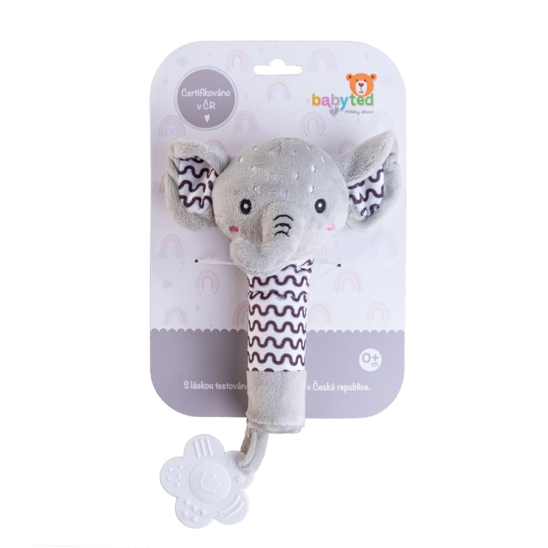 Roztomilý plyšový sloník je ideální první hračka pro miminka již od narození. Měkké tělo sloníka se lehce drží v malých ručičkách a při stisku vydává jemný pískací zvuk, který podporuje sluchový rozvoj a přirozeně upoutává pozornost miminka.Roztomilý plyšový sloník je ideální první hračka pro miminka již od narození. Měkké tělo sloníka se lehce drží v malých ručičkách a při stisku vydává jemný pískací zvuk, který podporuje sluchový rozvoj a přirozeně upoutává pozornost miminka. Na konci držátka je umístěno měkké plastové kousátko ve tvaru kytičky, které pomáhá ulevit citlivým dásním při prořezávání zoubků. Kontrastní vzory na tělíčku a ouškách podporují vizuální vnímání dítěte. Sloník je vyroben z hebkého a bezpečného plyše, který je vhodný pro nejmenší děti.