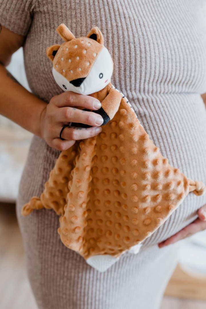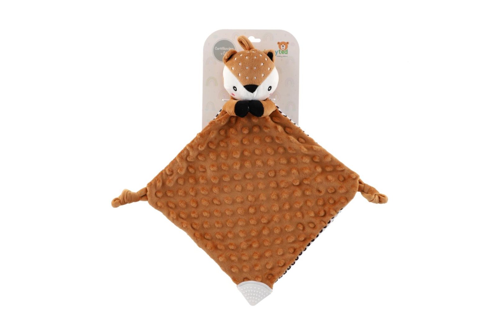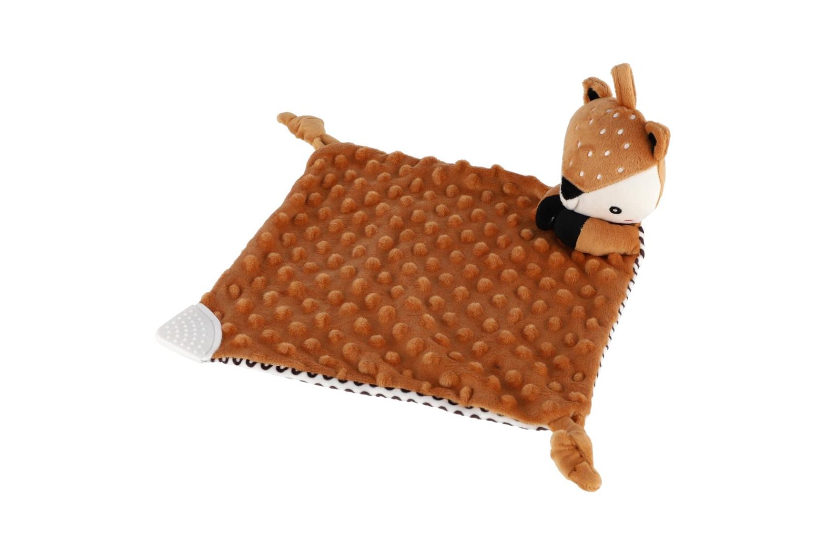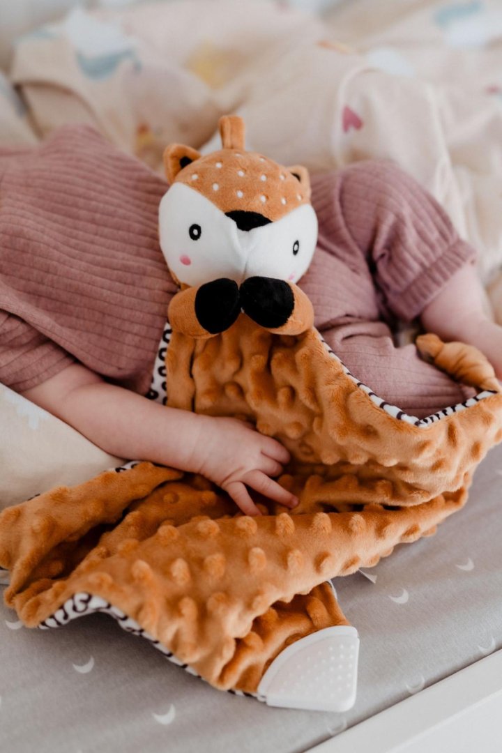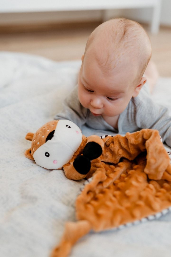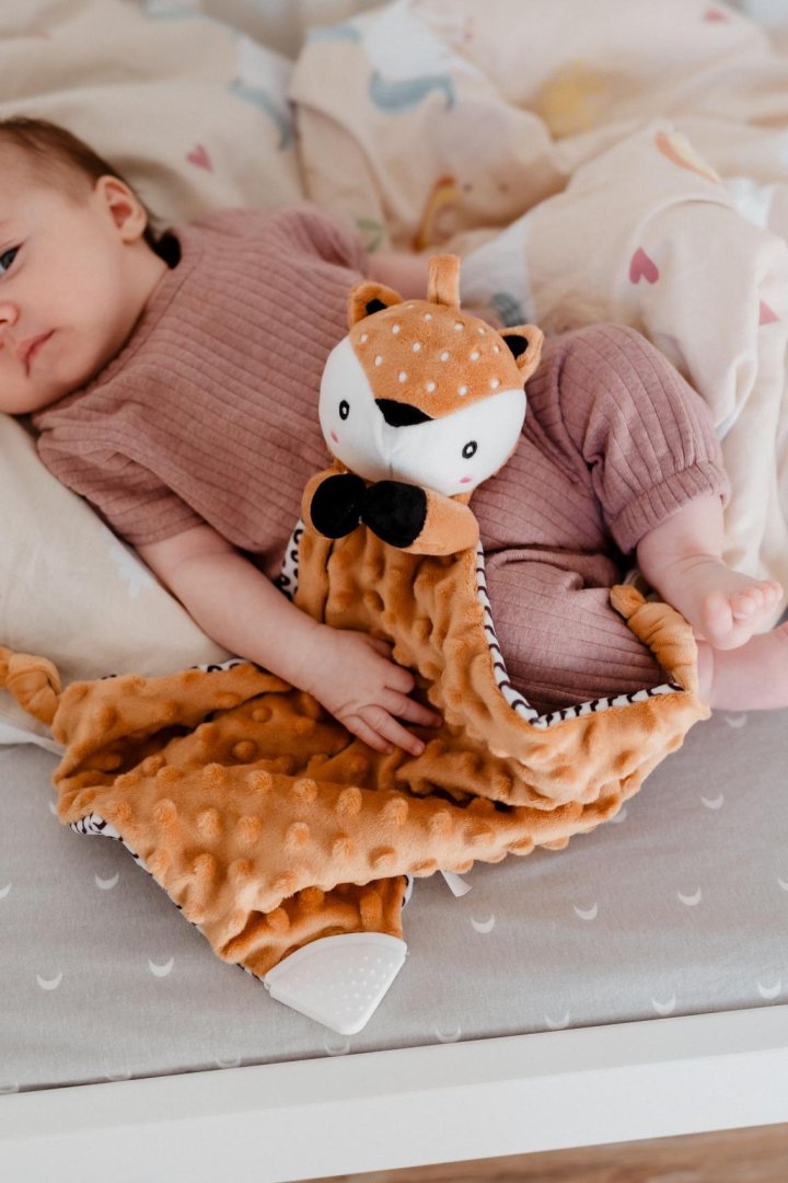 Roztomilý plyšový usínáček ve tvaru srnečka je ideálním společníkem pro nejmenší miminka již od narození.Roztomilý plyšový usínáček ve tvaru srnečka je ideálním společníkem pro nejmenší miminka již od narození. Měkoučká látka typu minky s 3D puntíky poskytuje příjemný dotek, který miminko uklidňuje a podporuje jeho smyslový rozvoj. Součástí je také měkké kousátko vhodné při prořezávání zoubků a jemné chrastítko, které podporuje zvědavost a rozvíjí sluchové vnímání.
