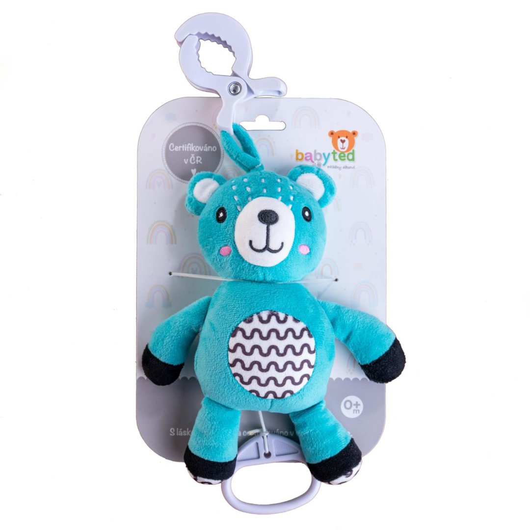 Roztomilý plyšový medvídek s natahovacím hracím strojkem je krásná a uklidňující hračka pro miminka již od narození. Po zatáhnutí za táhlo začne medvídek přehrávat jemnou ukolébavku, která pomáhá děťátku zklidnit se a pohodlně usnout.Roztomilý plyšový medvídek s natahovacím hracím strojkem je krásná a uklidňující hračka pro miminka již od narození. Po zatáhnutí za táhlo začne medvídek přehrávat jemnou ukolébavku, která pomáhá děťátku zklidnit se a pohodlně usnout. Díky praktickému závěsnému klipu je možné medvídka snadno připevnit na postýlku, kočárek, autosedačku nebo hrací hrazdičku, takže bude mazlivý kamarád vždy po ruce – ať už doma nebo na cestách. Medvídek je vyroben z měkkého hebkého plyše, který je příjemný na dotek a ideální pro první kontakt dětí s různými texturami. Kontrastní vzory na bříšku navíc podporují vizuální vnímání miminek.