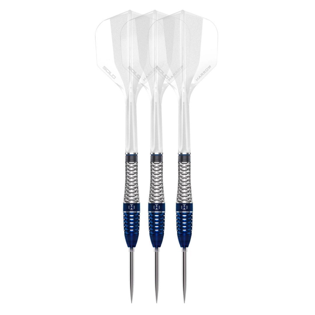 Steelové šipky Geo jsou kvalitní wolframové šipky (90% tungsten) s modro-stříbrnými barrely v dokonalém designu. Barrely jsou doplněny integrovanými plastovými letkami s násadkami Harrows Solo a hroty Quick Point.