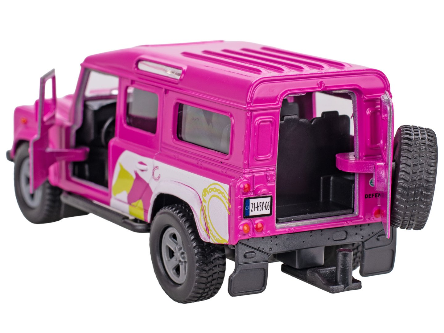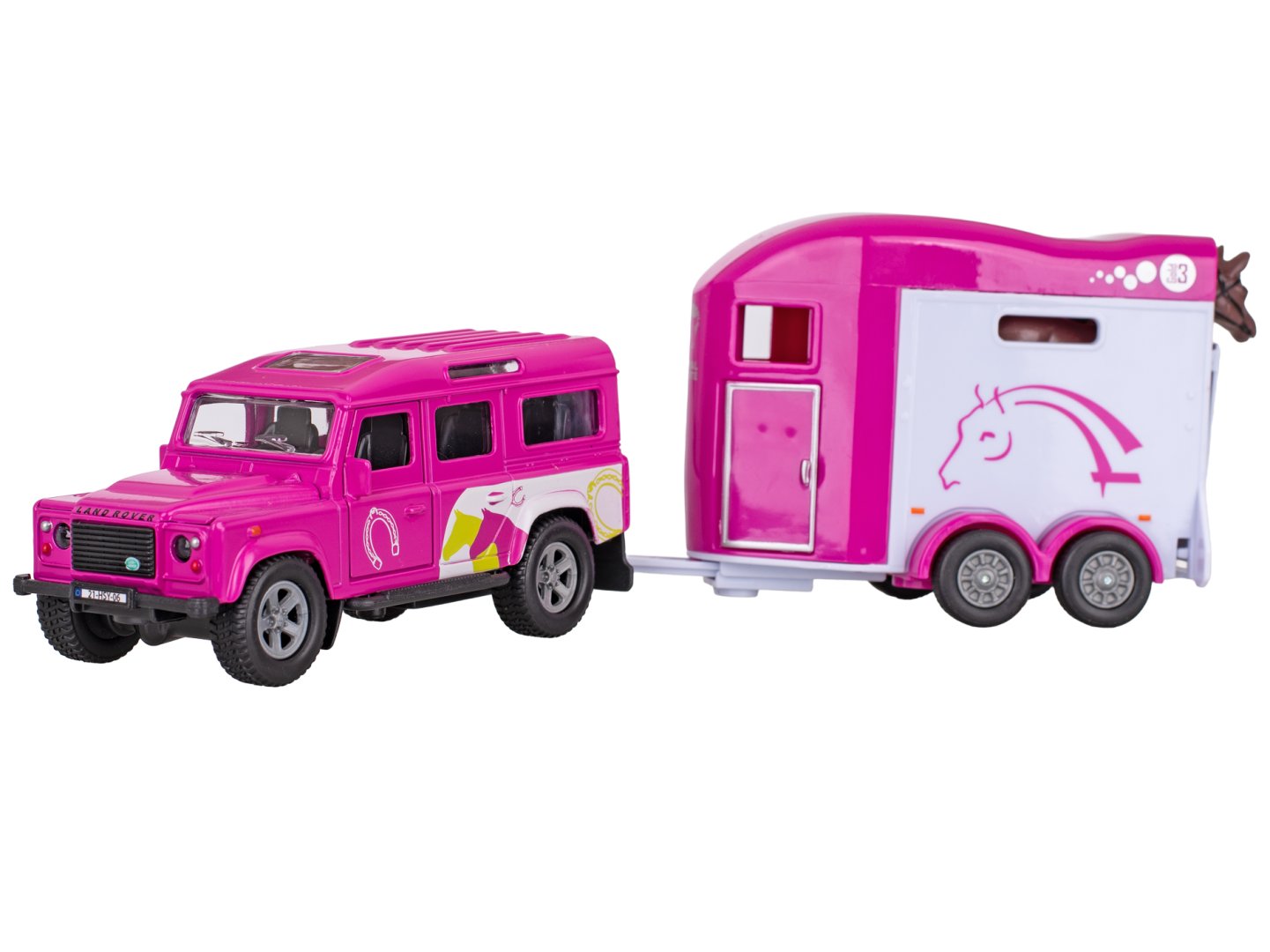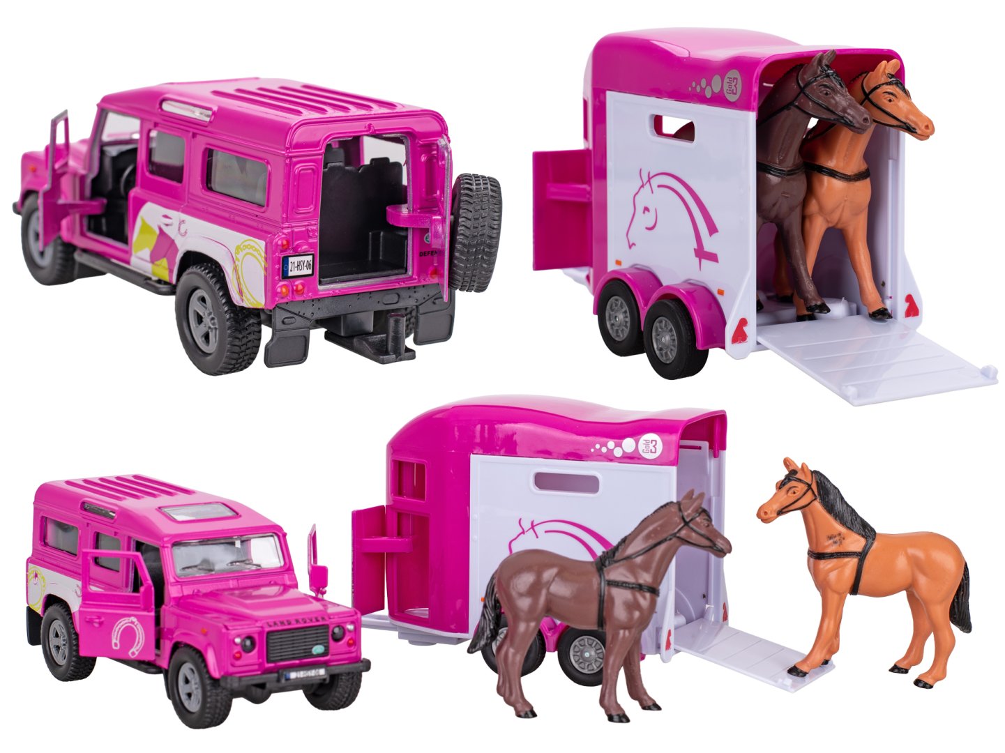 Tato krásná souprava kovového modelu terénního vozu Land Rover a přívěsu je snem každé malé milovnice koní. Vydejte se s ní na farmu, závody nebo na projížďku po lesních cestách! Land Rover je na zpětný chod a v atraktivní růžové barvě vynikne v každé sbírce. Figurky nejsou součástí balení.
