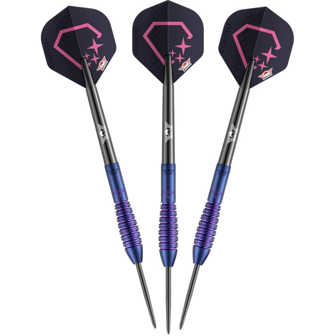 Steelové šipky Christel Timmermans jsou wolframové šipky (90% tungsten) s fialovými barrely v jedinečném designu. Barrely jsou doplněny nylonovými násadkami a letkami Christel Timmermans.