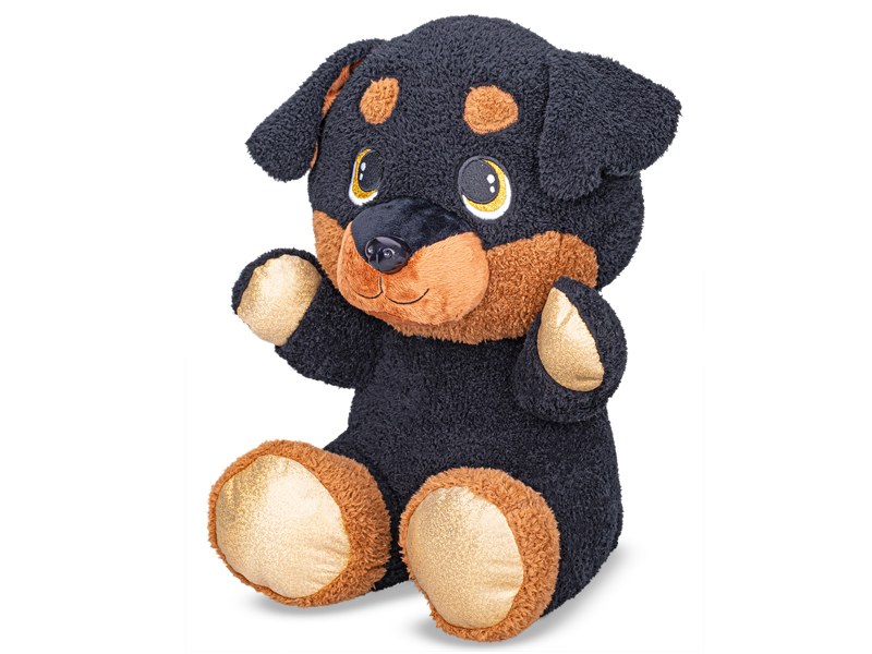 Tento nádherný rotvajler v sedící póze je dokonalou zmenšeninou oblíbeného psího plemene. Má typické zbarvení, inteligentní pohled a neuvěřitelně hebký kožíšek. I když v reálu budí respekt, tento plyšový kamarád je stvořený pro jediné – pro nekonečné objímání a mazlení.