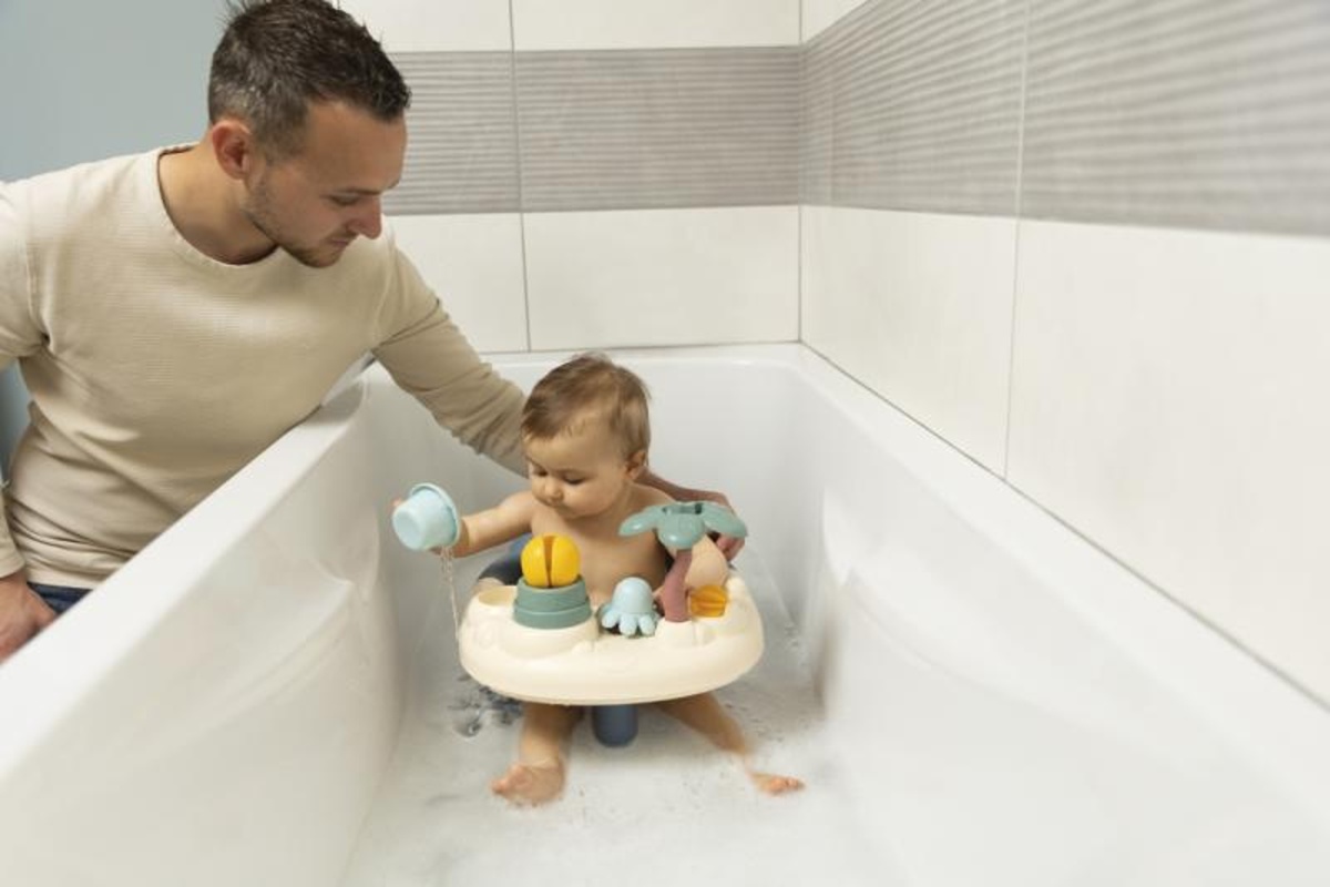 2v1 - sedátko do vany s hracím pultíkem nabízí nejmenším dětem skvělou zábavu při koupání a zároveň maximální bezpečnost. Ergonomický tvar s měkkým sedákem a oblé tvary bez hran zajistí bezpečné pohodlí. Pro snazší usazení dítěte lze pultík s aktivitami posunout dopředu díky promyšleném bezpečnostnímu systému. Čtyři přísavky zajišťují bezpečné uchycení ve vaně. Hrací pultík je vybaven 5 vodními aktivitami: vodní mlýnek, kelímek, palmový rozprašovač, kouzelná květina a chobotnice stříkající vodu.
