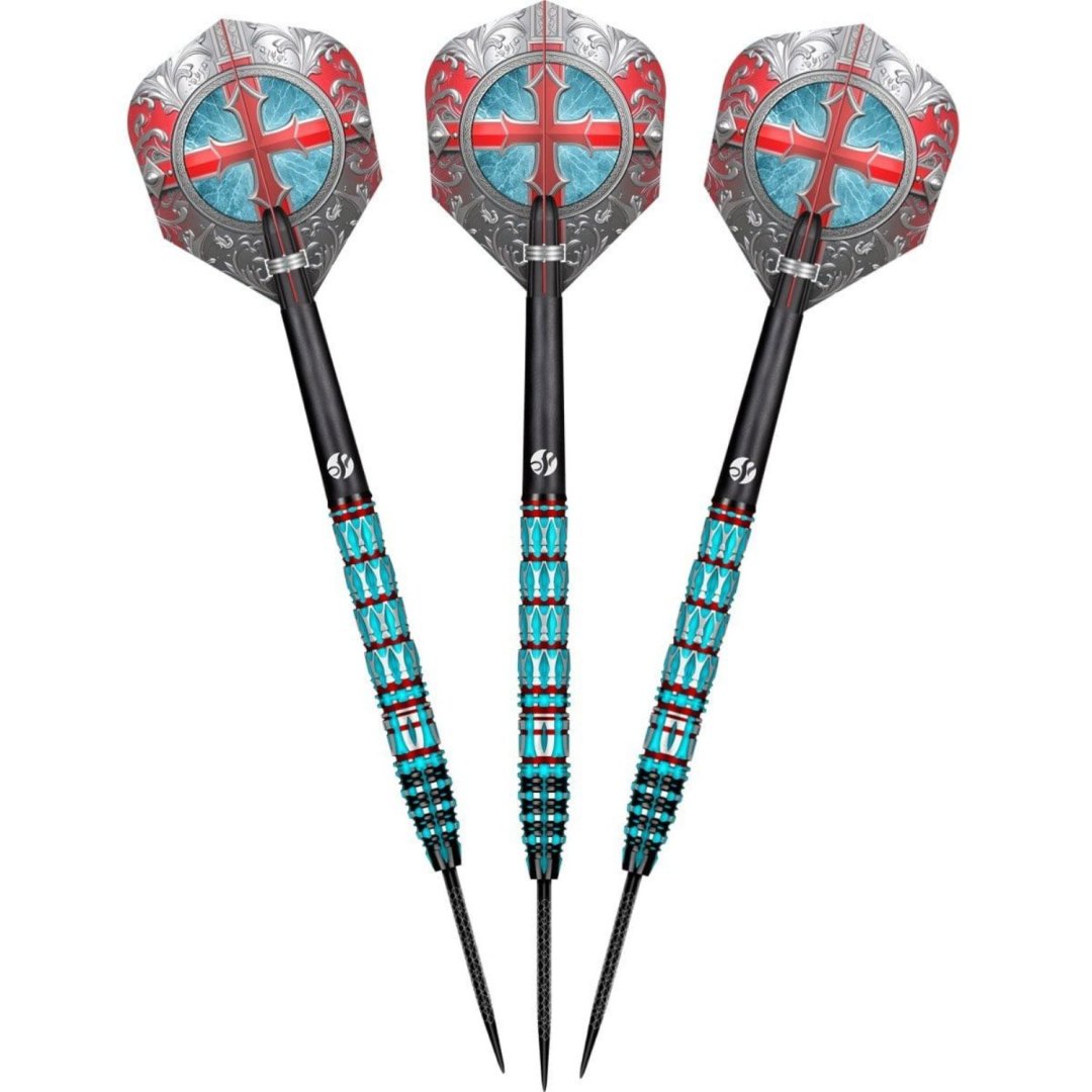Steelové šipky Shot Future Knights St George jsou wolframové šipky (95% tungsten) v naprosto ohromujícím designu. Jedinečné drážkování barrelu a kombinace tyrkysové, černé červené barvy dodává šipce dokonalý vzhled. Barrely jsou doplněny nylonovými násadkami a letkami Shot. Součástí balení je jedna sada násadek a letek navíc. Vše je uloženo v krabičce s designem St George.