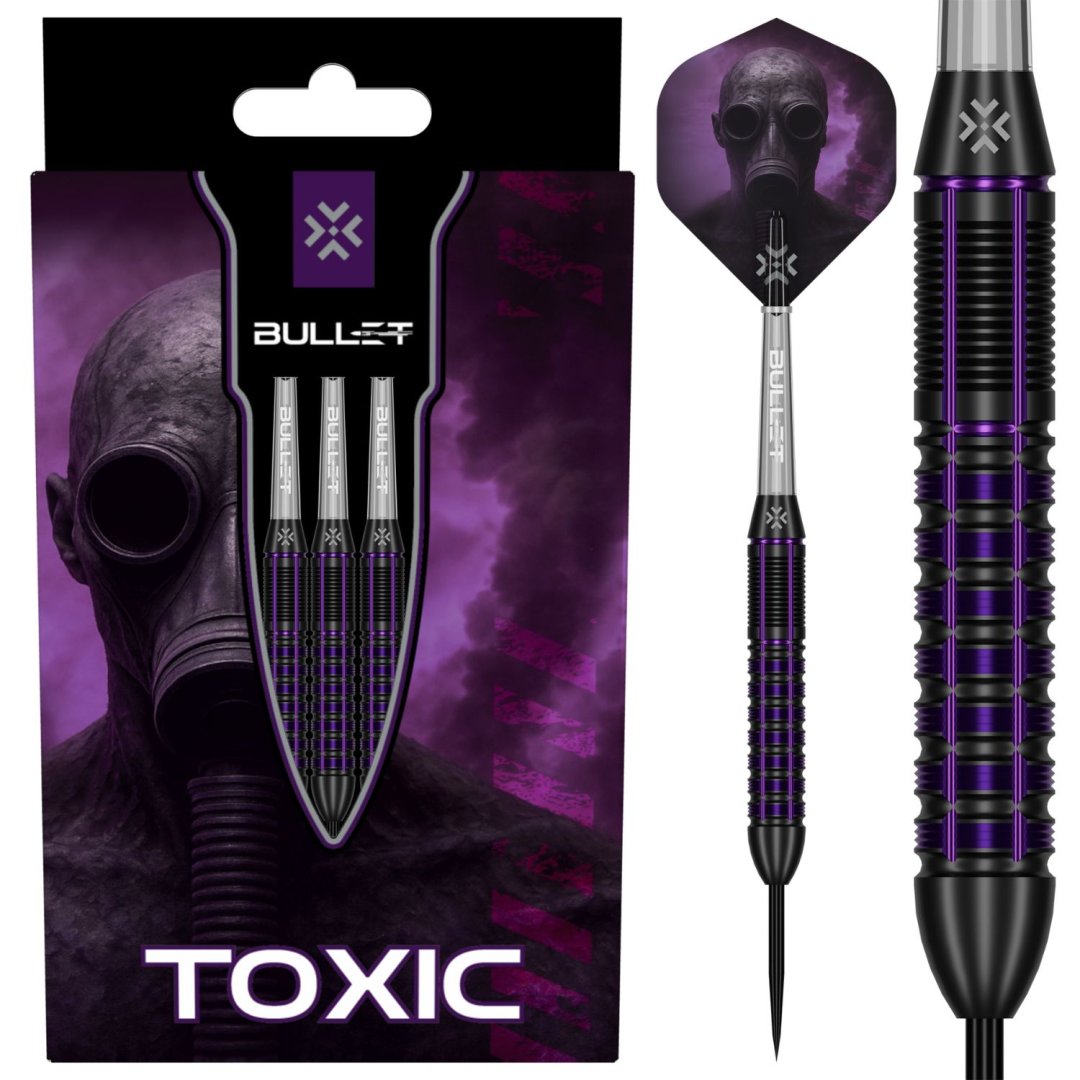 Steelové šipky Bullet Toxic jsou mosazné šipky s černými barrely s fialovými drážkami, což dodává šipce dokonalý vzhled. Barrely doplňují nylonové násadky a letky Bullet Toxic.