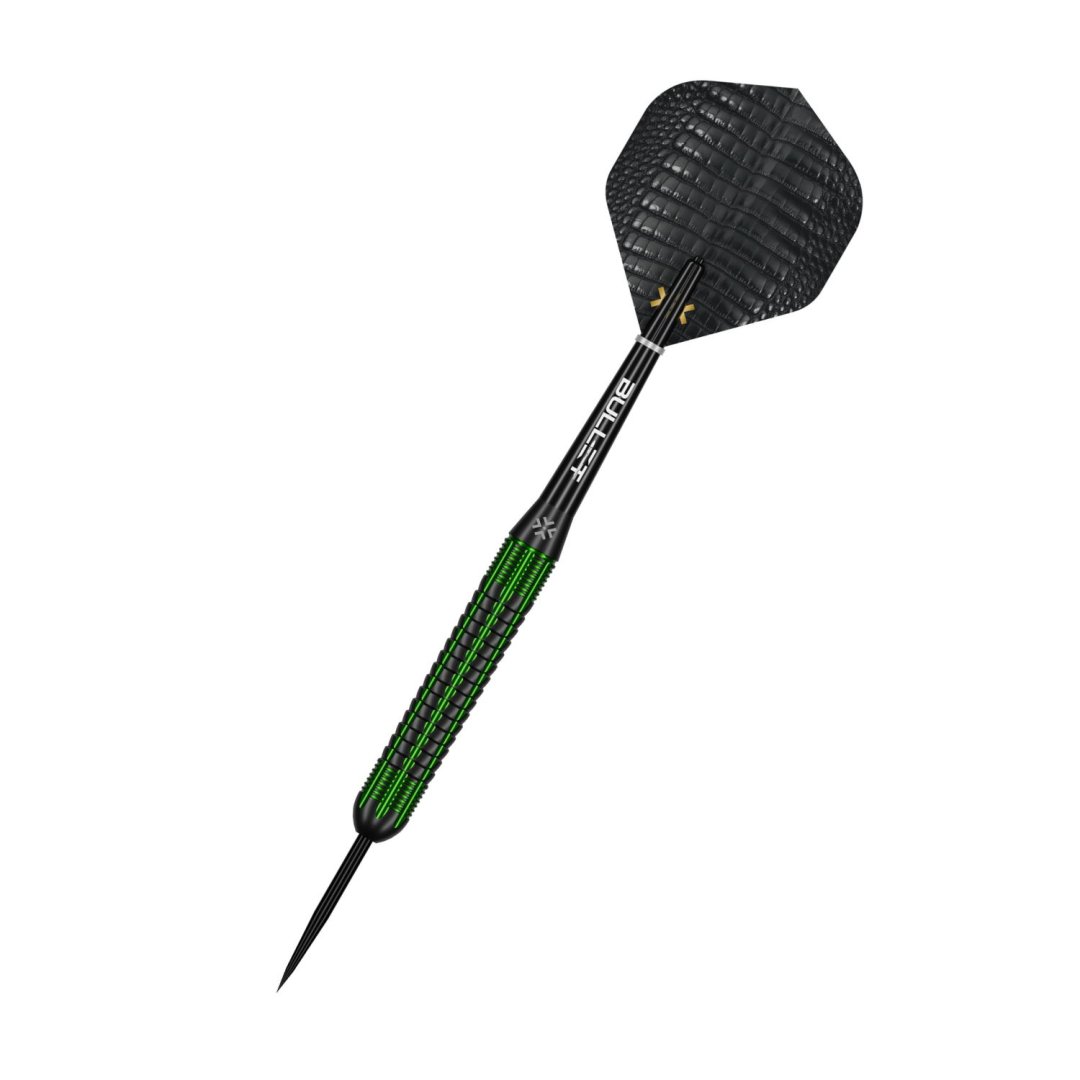 Steelové šipky Bullet Gator jsou mosazné šipky s černými barrely se zelenými drážkami, což dodává šipce dokonalý vzhled.