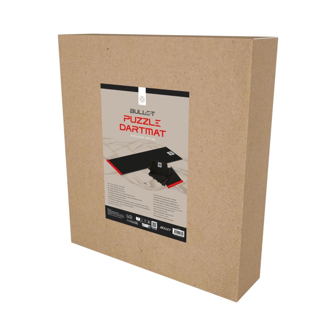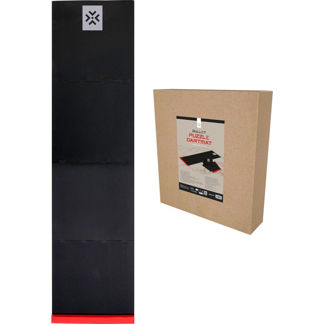Koberec k terči Bullet Puzzle Dart Mat je praktický koberec s oche (čárou) složený ze 4 dílů. Poskytuje optimální ochranu pro padající šipky.