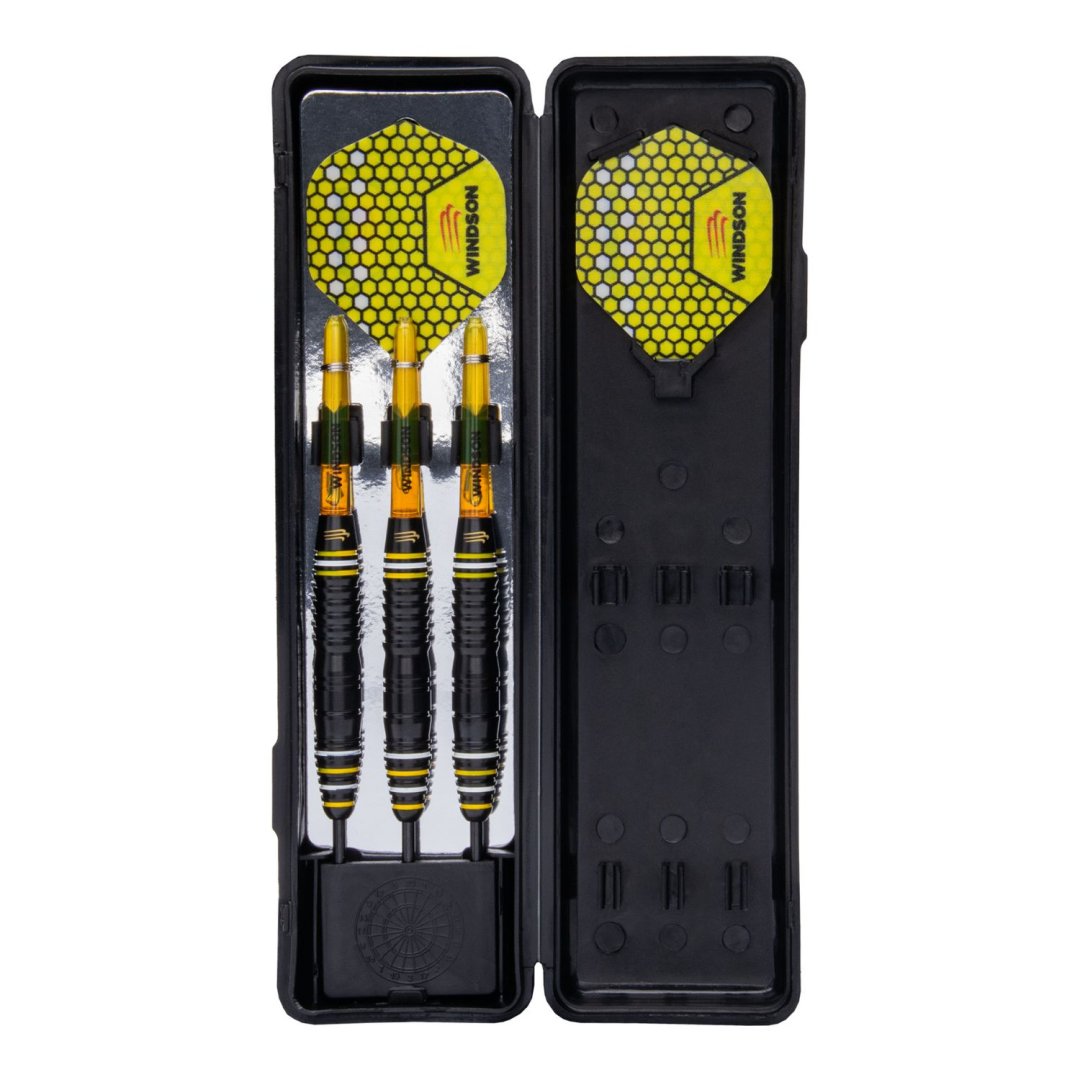 Steelové šipky Windson Bee Zone jsou mosazné šipky s černými barrely, které zdobí žluté a bílé proužky.