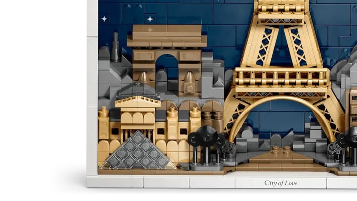 Ukažte světu svou lásku k Paříži a jejím ikonickým památkám se sběratelskou stavebnicí Lego Architecture Paříž – město lásky pro dospělé od 18 let.Ukažte světu svou lásku k Paříži a jejím ikonickým památkám se sběratelskou stavebnicí Lego Architecture Paříž – město lásky pro dospělé od 18 let. Tento výstavní kousek poslouží jako úžasný architektonický dárek pro vás a všechny milovníky historie či cestování. Tento model představuje panoráma Paříže s dominantní Eiffelovou věží uprostřed, kterou lze při stavbě doplnit o vrcholovou část. Stavebnice kombinuje jemné detaily známých staveb, jako jsou katedrála Notre-Dame, Vítězný oblouk nebo skleněná pyramida Louvru, a vytváří tak kompaktní architektonický celek zasazený do elegantního bílého rámečku. Model je navržen tak, aby bylo možné jej pohodlně vystavit jak na polici, tak zavěsit na zeď. Zadní strana rámečku je ozdobena tmavě modrými kostkami s hvězdnými motivy, které evokují noční oblohu nad Paříží, čímž dodávají celé scéně romantickou atmosféru. Barevné provedení modelu využívá převážně béžové, šedé a černé odstíny, které podtrhují autentický vzhled památek a zároveň umožňují snadné rozpoznání jednotlivých staveb.