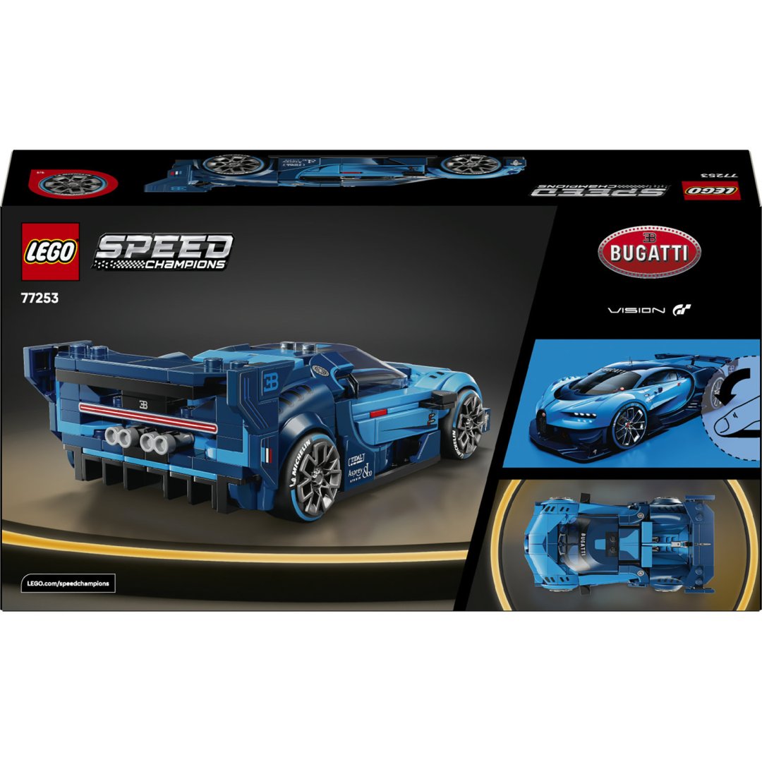Lego Speed Champions představuje detailní model hypersportovního auta Bugatti Vision Gran Turismo, který je určený pro děti od 9 let a starší.Lego Speed Champions představuje detailní model hypersportovního auta Bugatti Vision Gran Turismo, který je určený pro děti od 9 let a starší. Stavebnice umožňuje postavit věrnou repliku luxusního vozu navrženého automobilkou Bugatti pro videohru Gran Turismo z roku 2015. Model vyniká svým výrazným modrým provedením, které je doplněno o řadu autentických detailů, jako je přední maska ve tvaru podkovy s číslem 16, osm světlometů, střešní ploutev a výrazné zadní křídlo. Široké pneumatiky s potiskem značky Michelin přispívají k realistickému vzhledu vozu. Součástí stavebnice je také minifigurka jezdce v oblečení s logem Bugatti, která může být umístěna do kokpitu modelu. Díky tomu si děti mohou nejen užít samotné stavění, ale také následné hraní závodních scénářů.