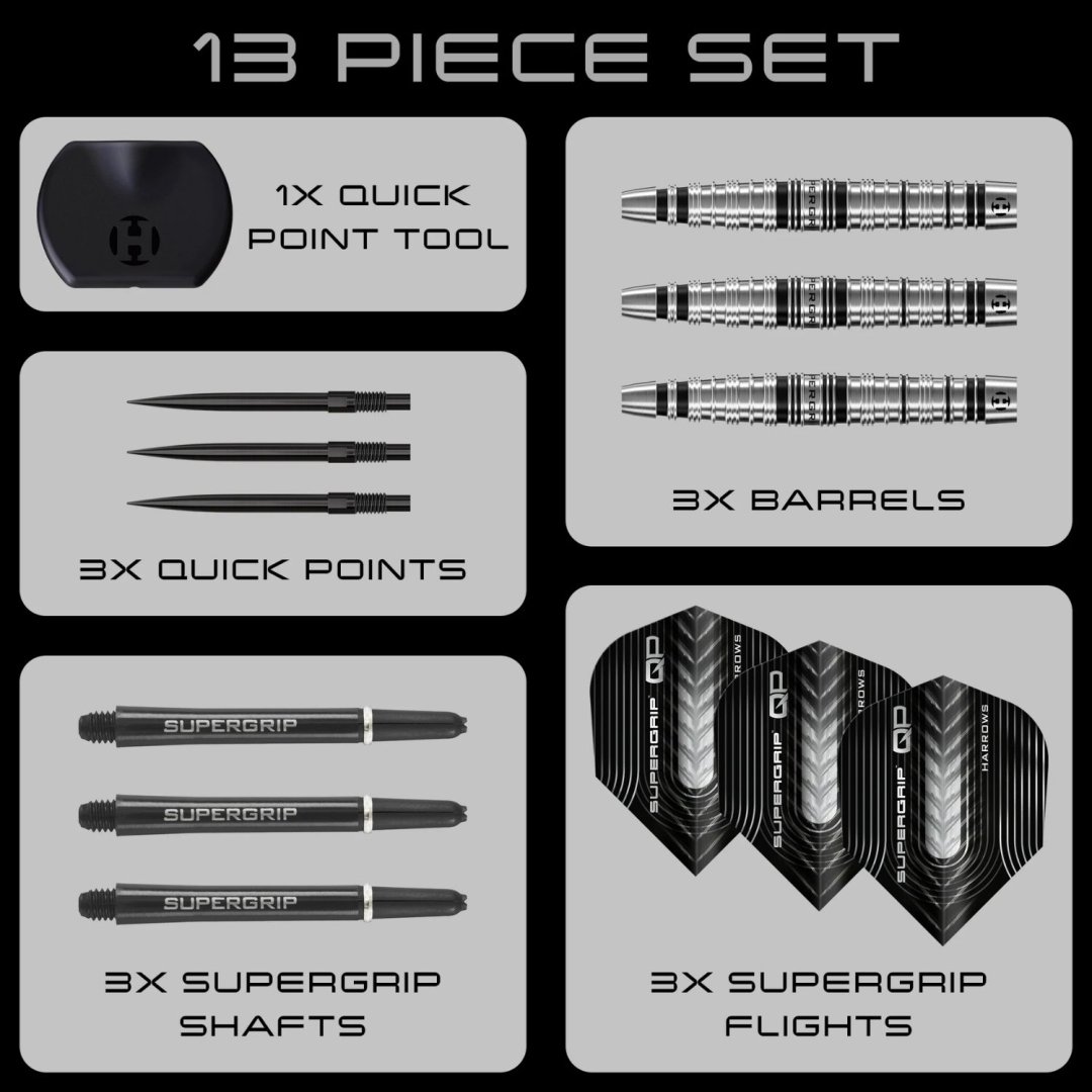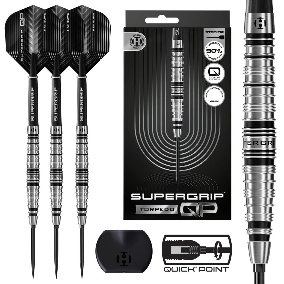 Steelové šipky Supergrip QP jsou kvalitní wolframové šipky (90% tungsten) v ohromujícím designu. Barrely mají některé drážky zvýrazněny černou barvou. Doplněny jsou násadkami Supergrip, letkami Supergrip QP a hroty Quick Point. Součástí balení je i nástroj na výměnu hrotů Quick Point Tool.