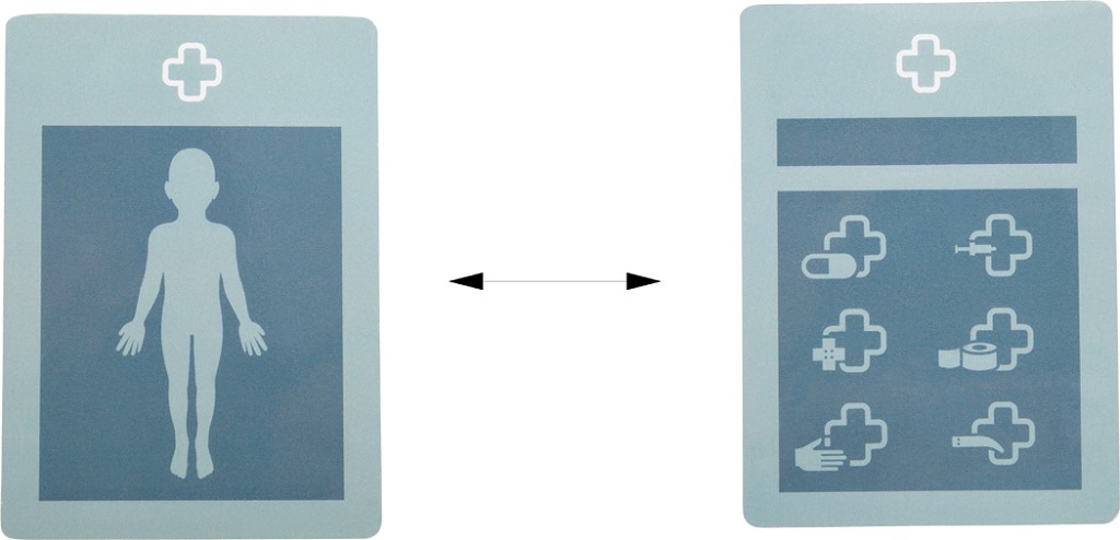 obsahuje: injekční stříkačka, teploměr, zapisovatelná karta včetně popisovače, stetoskop, obvaz, špachtle a pinzeta