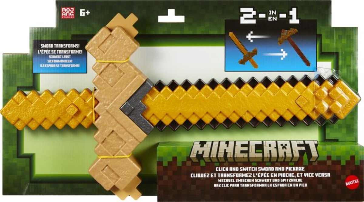 Fanoušci si mohou přenést dobrodružství z Minecraftu do skutečného světa s touto hračkou 2v1 - stiskem tlačítka se promění z krumpáče na meč a snadno se vrátí zpět na krumpáč.EAN: 194735346479