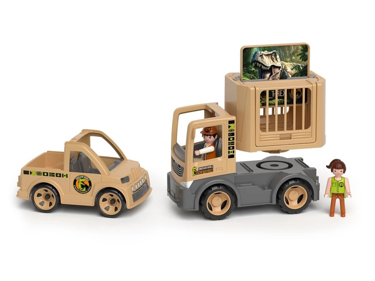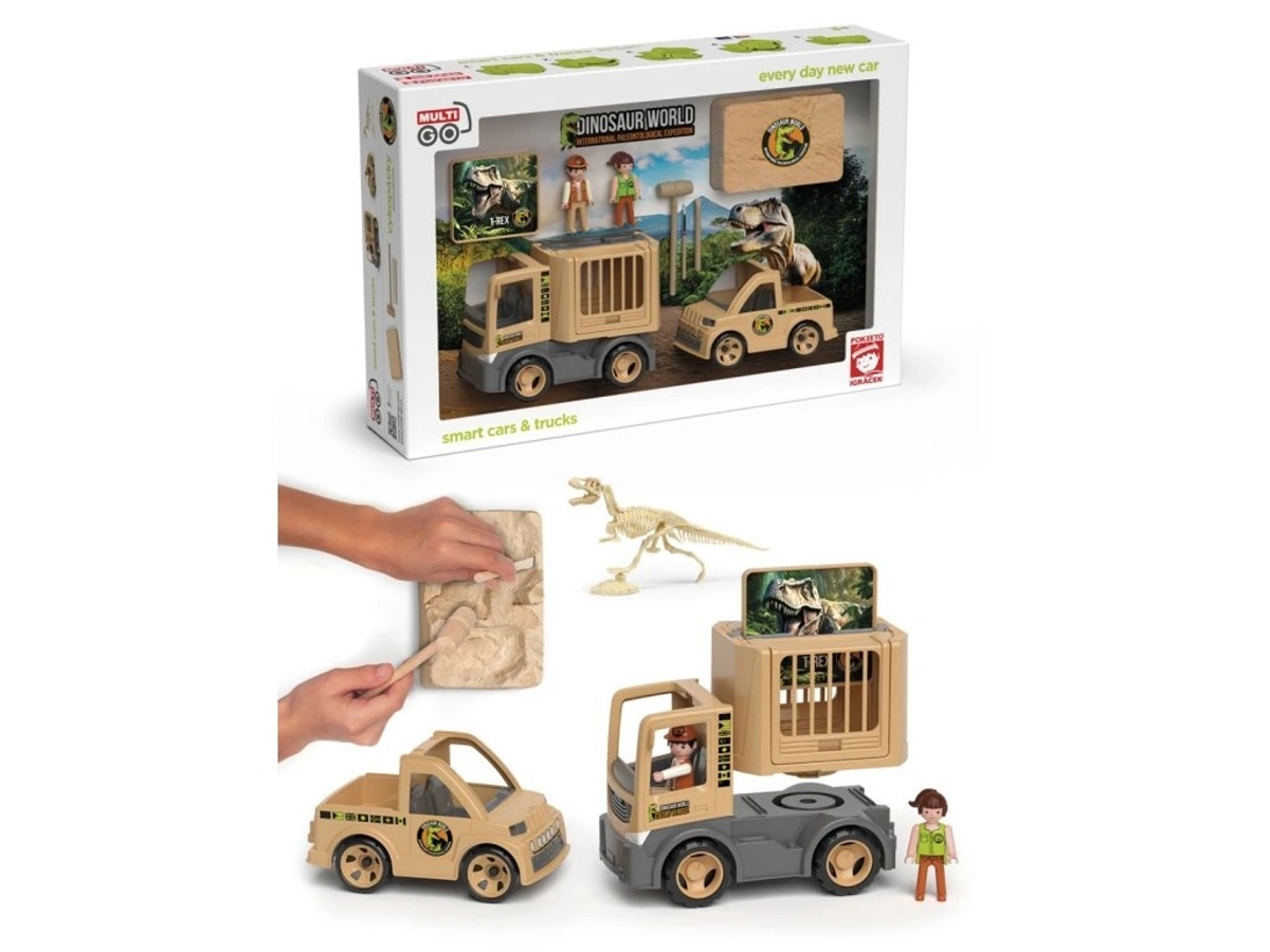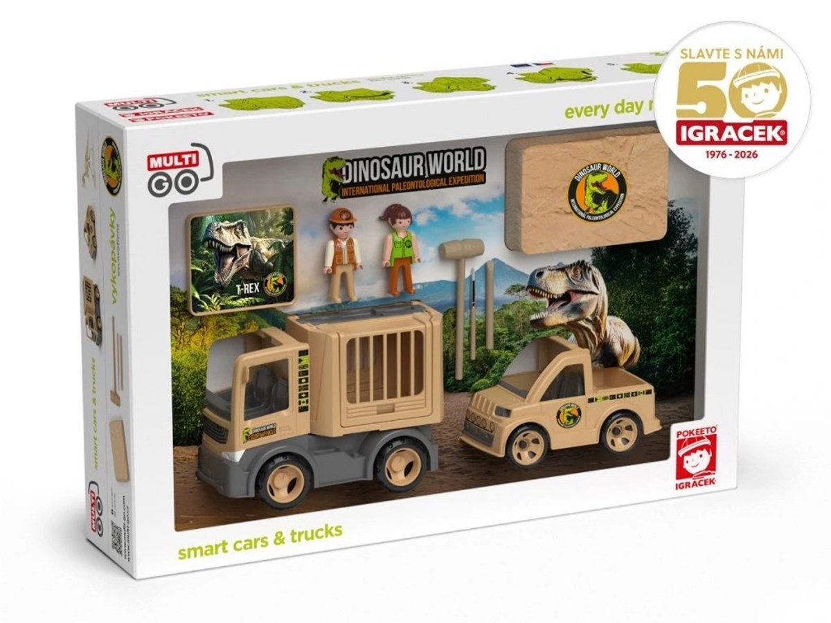 Vydejte se s Igráčky v expedičních autech MultiGO na dobrodružnou paleontologickou výpravu. Objevte s pomocí nářadí části kostry a složte si tyranosaura rexe. Naložte nářadí do pickupu, kamionem dopravte vše až k „vykopávce“. Opatrně prozkoumejte blok s kostmi a postupně odhalujte jednotlivé části. Srovnejte dílky podle tvarů a poskládejte ikonického T-rexe. Vymyslete mise – měření nálezů, přesun exponátů, ochrana naleziště, práce týmu paleontologů a podobně.
