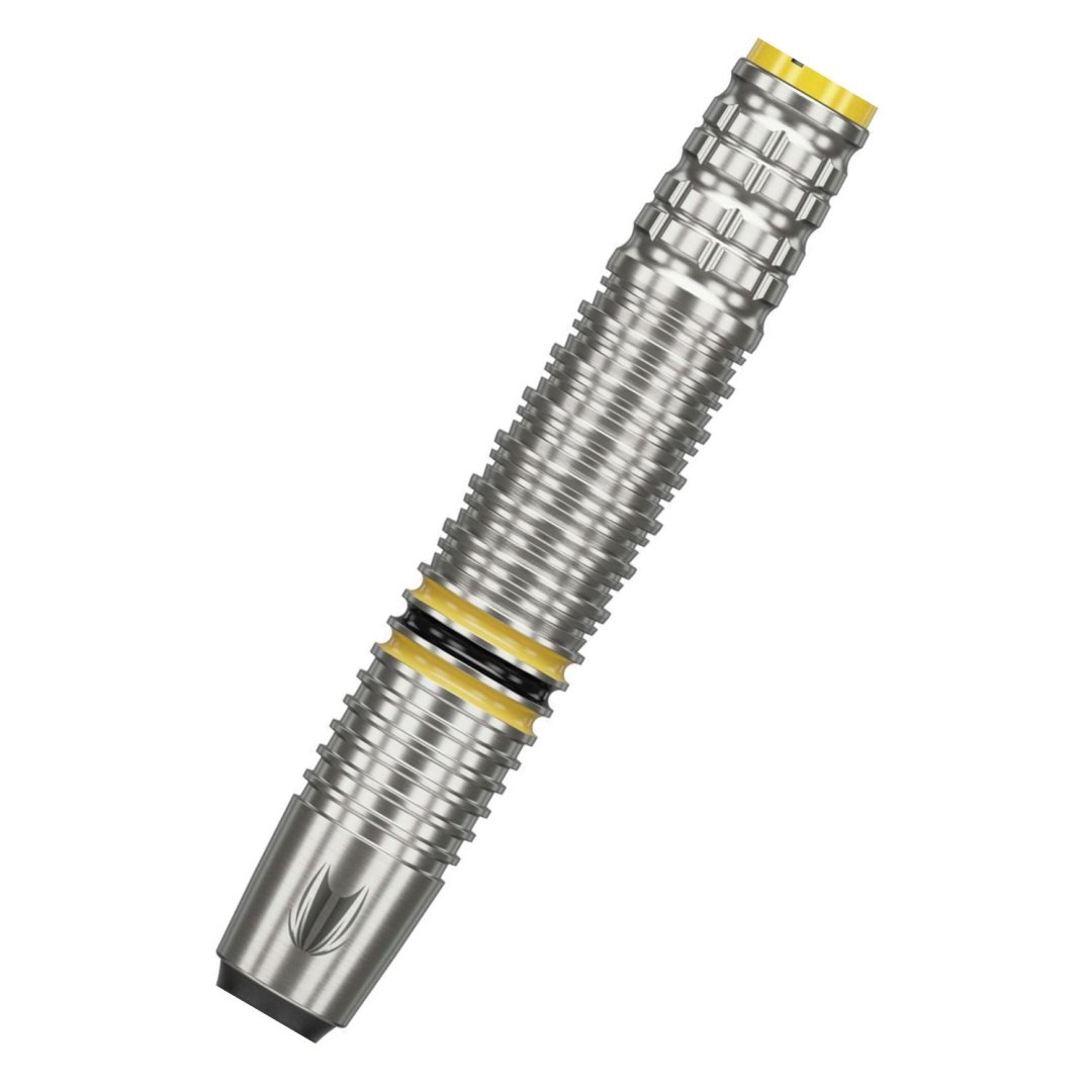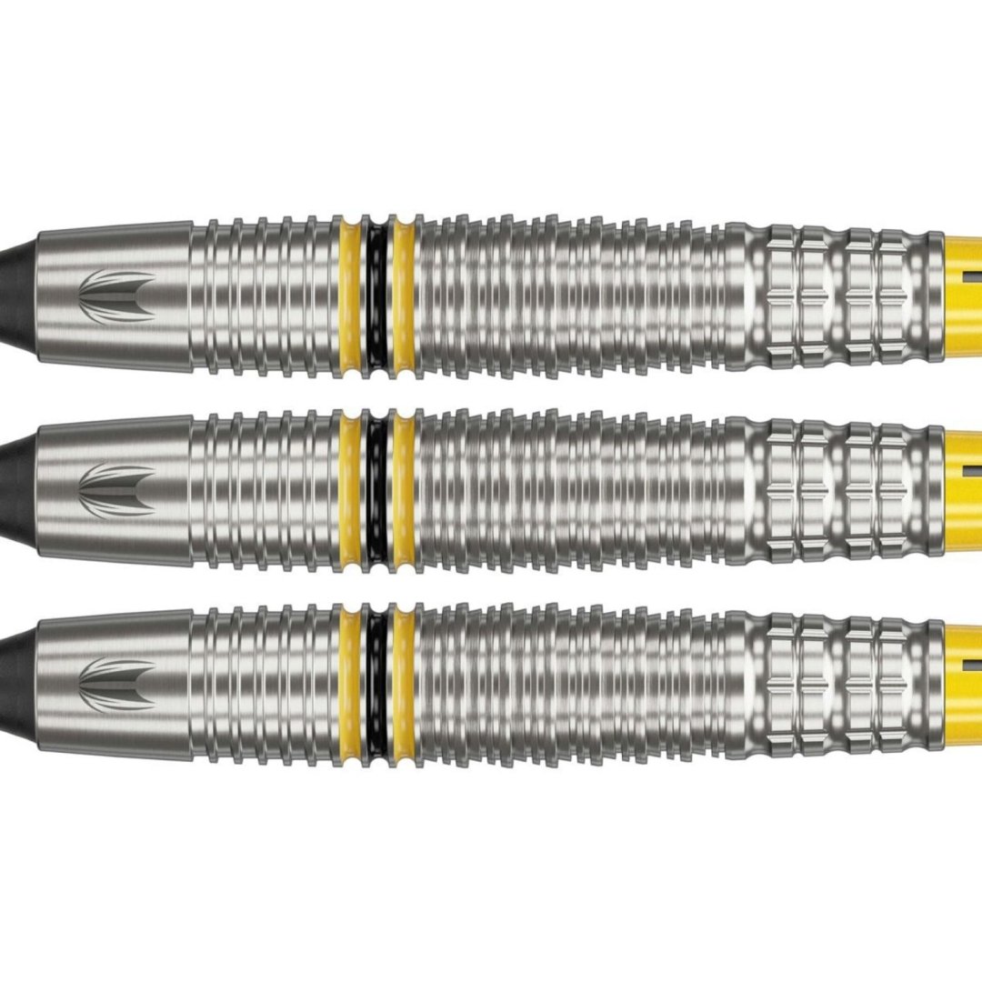 Softové wolframové šipky Scott Williams (90% tungsten) jsou šipky s vroubkovanými barrely, které zdobí žlutý a černý proužek.