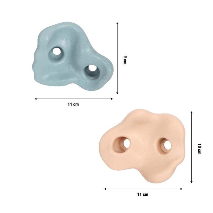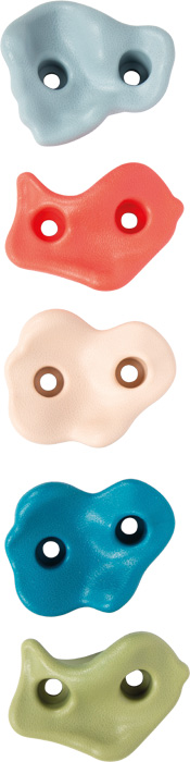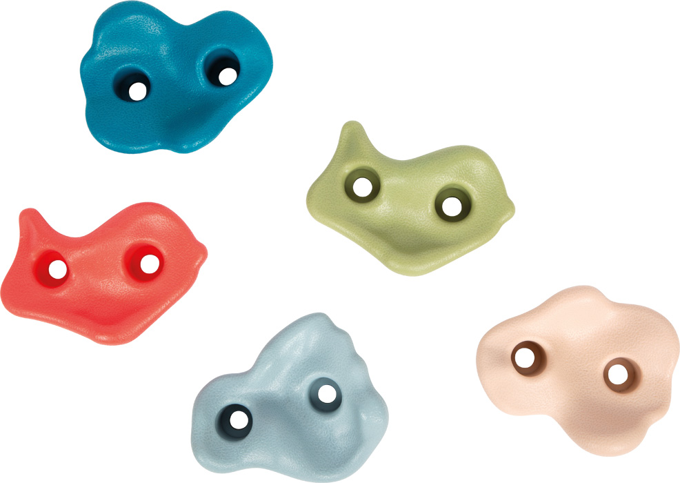 Tato sada 5 lezeckých chytů různých tvarů, vyrobených z odolného plastu, přináší zábavu z lezení v moderních barvách na každou stěnu.Tato sada 5 lezeckých chytů různých tvarů, vyrobených z odolného plastu, přináší zábavu z lezení v moderních barvách na každou stěnu. Ať už na dřevěné desce v dětském pokoji, na zahradní zdi nebo na hrací věži. Díky přilnavému povrchu, dvoubodovému upevnění odolnému proti protočení a dodávanému montážnímu kování lze chyty individuálně rozmístit. Snadno se tak přizpůsobí věku, velikosti i lezeckým schopnostem dítěte a umožní vytvářet nápadité lezecké trasy s vysokou herní a sportovní hodnotou.
