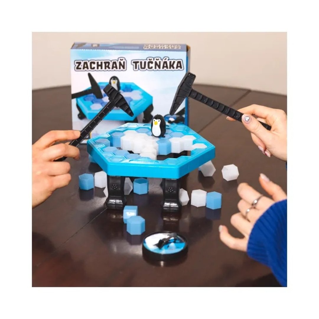 Poutavá rodinná hra plná zábavy a napětí! Klepejte ledové kostky, ale pozor – nesmíte nechat tučňáka spadnout! Kdo má pevnou ruku a nejlepší strategii, vyhrává. Zatočte kolečkem a poté z ledové plochy vyklepněte odpovídající ledové kostky podle toho, kam ukazuje šipka. Ten, komu tučňák spadne prohrává a hra končí!
