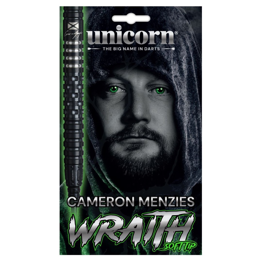 Softové šipky Unicorn Wraith Cameron Menzies jsou wolframové šipky (90% tungsten) s černými barrely. Barrely jsou doplněny zelenými nylonovými násadkami Gripper 4, letkami Wraith a hroty Epic.