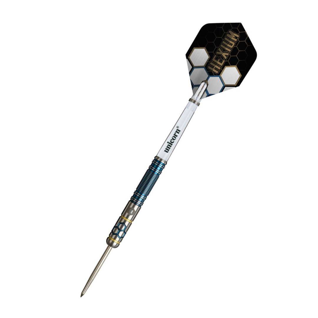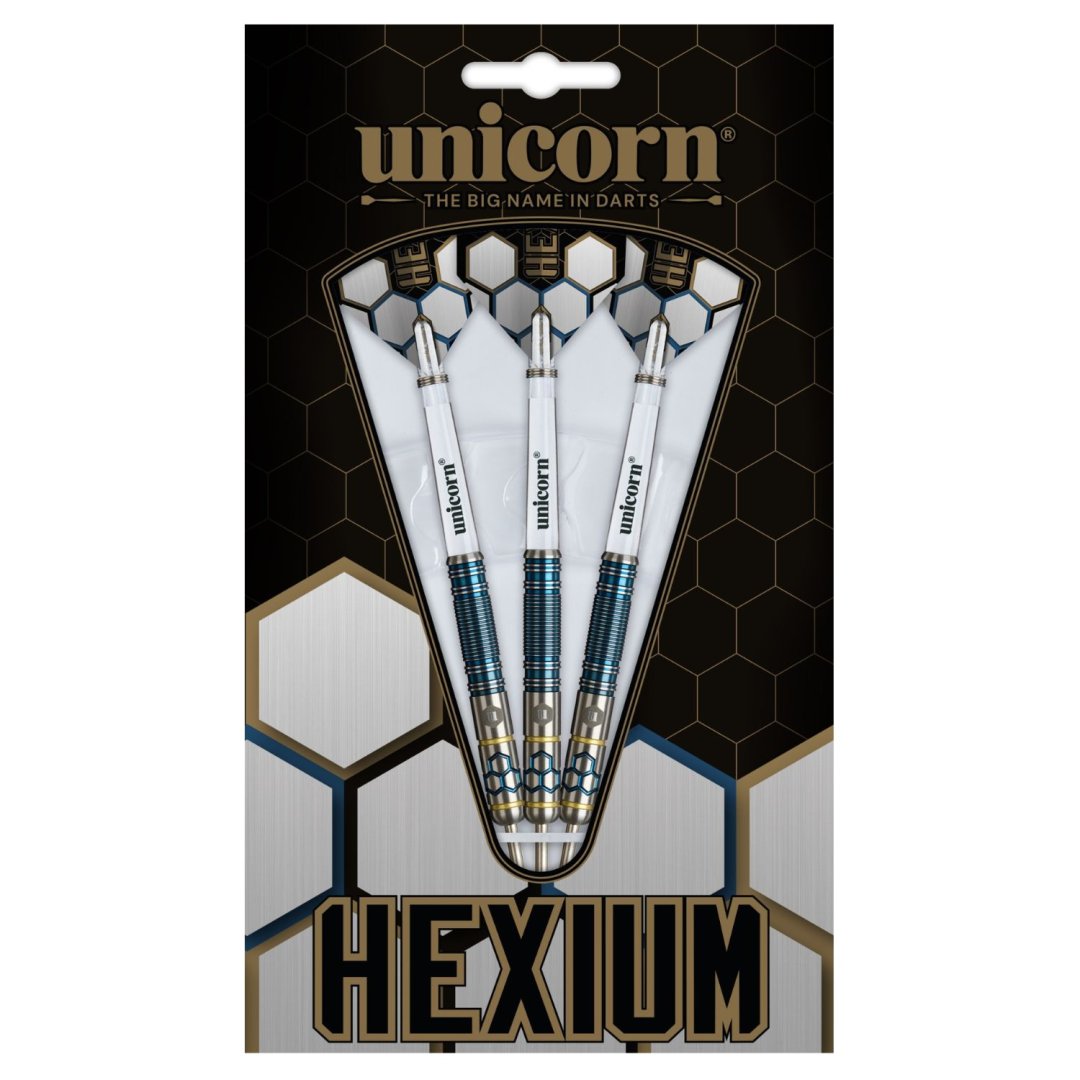 Steelové šipky Unicorn Hexium jsou wolframové šipky (90% tungsten) s barrely v originálním designu. Šipky Hexium kombinují komplexní zpracování s odvážným designem inspirovaným Japonskem. Je ideální pro pokročilé hráče, kteří preferují styl držení v zadní části. Složitě konstruovaný úchop Hexium zajišťuje konzistentní umístění prstů a plynulejší uvolnění. Nádherný modrý PVD povlak v kombinaci se zlatými pruhy dodává šipce nádech elegance. Barrely jsou doplněny nylonovými násadkami Gripper 4 a letkami Ultrafly.