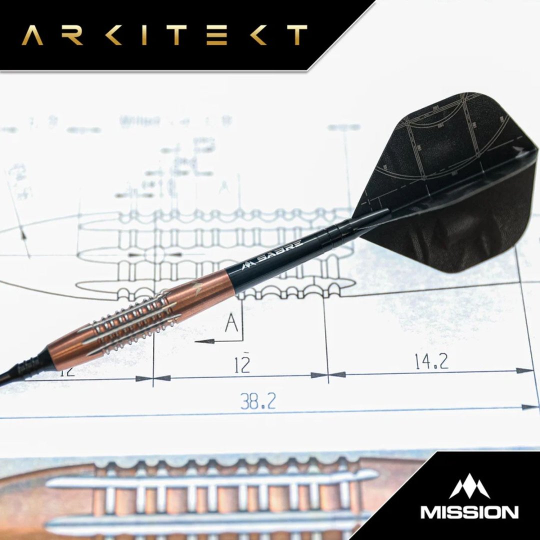 Softové šipky Mission Arkitekt jsou wolframové šipky (90 % tungsten) s bronzovými barrely v dokonalém designu. Barrely jsou doplněny nylonovými násadkami Sabre a letkami Mission.